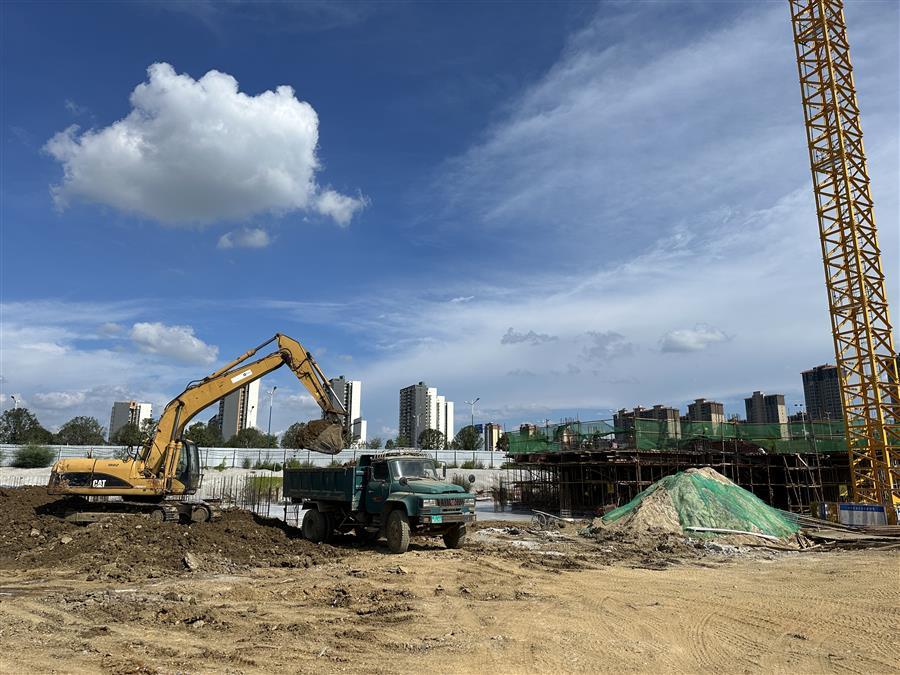在農(nóng)投思賢幸福加項(xiàng)目,技術(shù)人員測(cè)繪、工人在綁扎鋼筋各作業(yè)面工作人員緊張忙碌地開展工作;施工機(jī)械運(yùn)轉(zhuǎn)不停、運(yùn)輸車輛來回穿梭,一派繁忙景象。