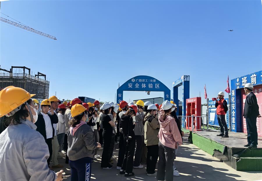 在參觀前,項(xiàng)目負(fù)責(zé)人簡要介紹了冶建公司發(fā)展歷程和項(xiàng)目概況,詳細(xì)講解了施工現(xiàn)場的各項(xiàng)安全注意事項(xiàng)。之后,所有人員佩戴好安全帽有序進(jìn)入施工現(xiàn)場進(jìn)行參觀。觀摩學(xué)習(xí)過程中,項(xiàng)目管理人員對項(xiàng)目正在進(jìn)行的二次結(jié)構(gòu)砌筑、型鋼混凝土結(jié)構(gòu)、盤扣架以及鋼筋綁扎等工序進(jìn)行了生動(dòng)形象地講解,并就工程的重點(diǎn)、難點(diǎn)問題和解決方法開展了現(xiàn)場答疑交流,將在建項(xiàng)目施工現(xiàn)場變?yōu)閷?shí)踐課堂,幫助學(xué)生們更好地把理論知識與實(shí)踐相結(jié)合,推動(dòng)參觀學(xué)習(xí)走深走實(shí)。