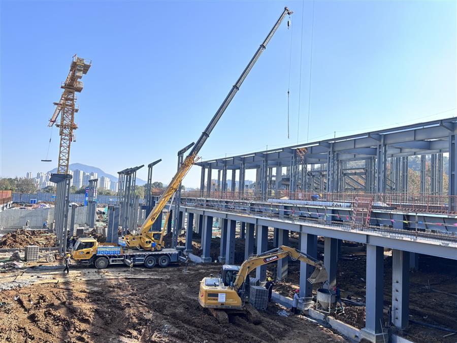 項(xiàng)目施工現(xiàn)場,機(jī)器轟鳴,工程車輛來回穿梭,工人們在各點(diǎn)位開展墊層、樓承板澆筑、鋼筋綁扎、栓釘焊接、基礎(chǔ)砌磚、屋面底板和鋼結(jié)構(gòu)梁柱安裝等施工作業(yè),處處涌現(xiàn)“冬忙”景象。