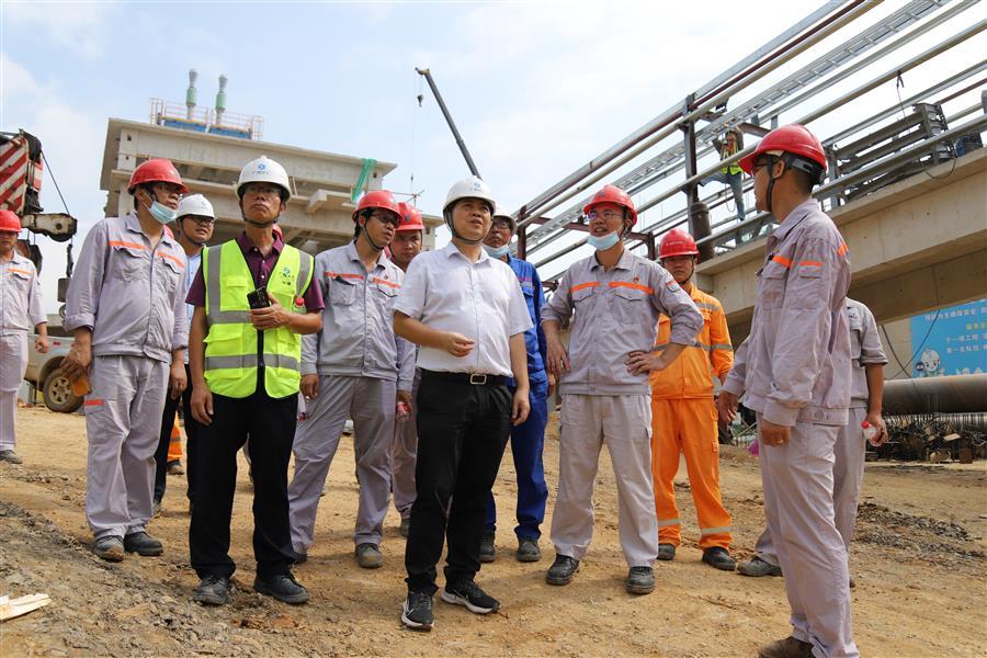 會前,蒙勝益、韋永軍深入項目施工現(xiàn)場,了解各項工作推進情況,詳細聽取項目部各項工作匯報,并就具體工作和問題進行交流討論和指導。