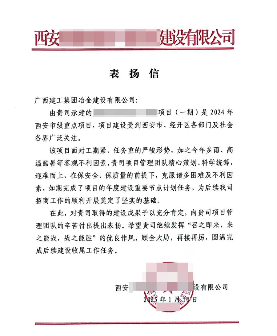 來信稱,冶建公司在項目施工時間緊、任務(wù)重的嚴峻形勢下,精心策劃、迎難而上,一手抓安全一手抓質(zhì)量,克服諸多困難及不利因素,如期完成了項目的年度建設(shè)重要節(jié)點計劃任務(wù),為后續(xù)招商工作的順利開展奠定了堅實的基礎(chǔ)。