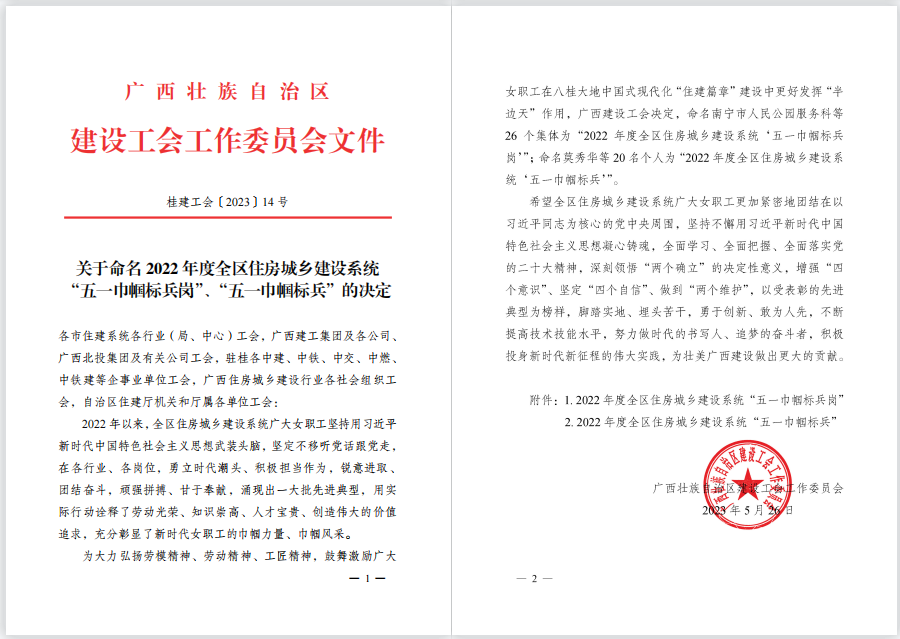 近日,廣西建設(shè)工會工作委員會下發(fā)了《關(guān)于命名2022年度全區(qū)住房城鄉(xiāng)建設(shè)系統(tǒng)“五一巾幗標兵崗”“五一巾幗標兵”的決定》,冶建經(jīng)營公司造價咨詢中心榮獲“五一巾幗標兵崗”稱號。